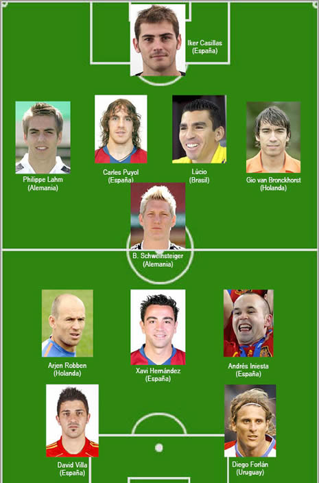 Iker Casillas (España); Sergio Ramos (España), Carles Puyol (España), Arne Friedrich (Alemania), Fabio Coentrao (Portugal); Thomas Müller (Alemania), Sami Khedira (Alemania), Wesley Sneijder (Holanda), Xavi (España); Diego Forlán (Uruguay) y David Villa (España).