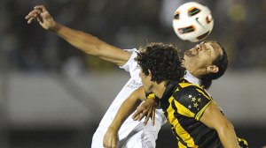 Hernán Barcos dominando la pelota ante Matías Corujo
