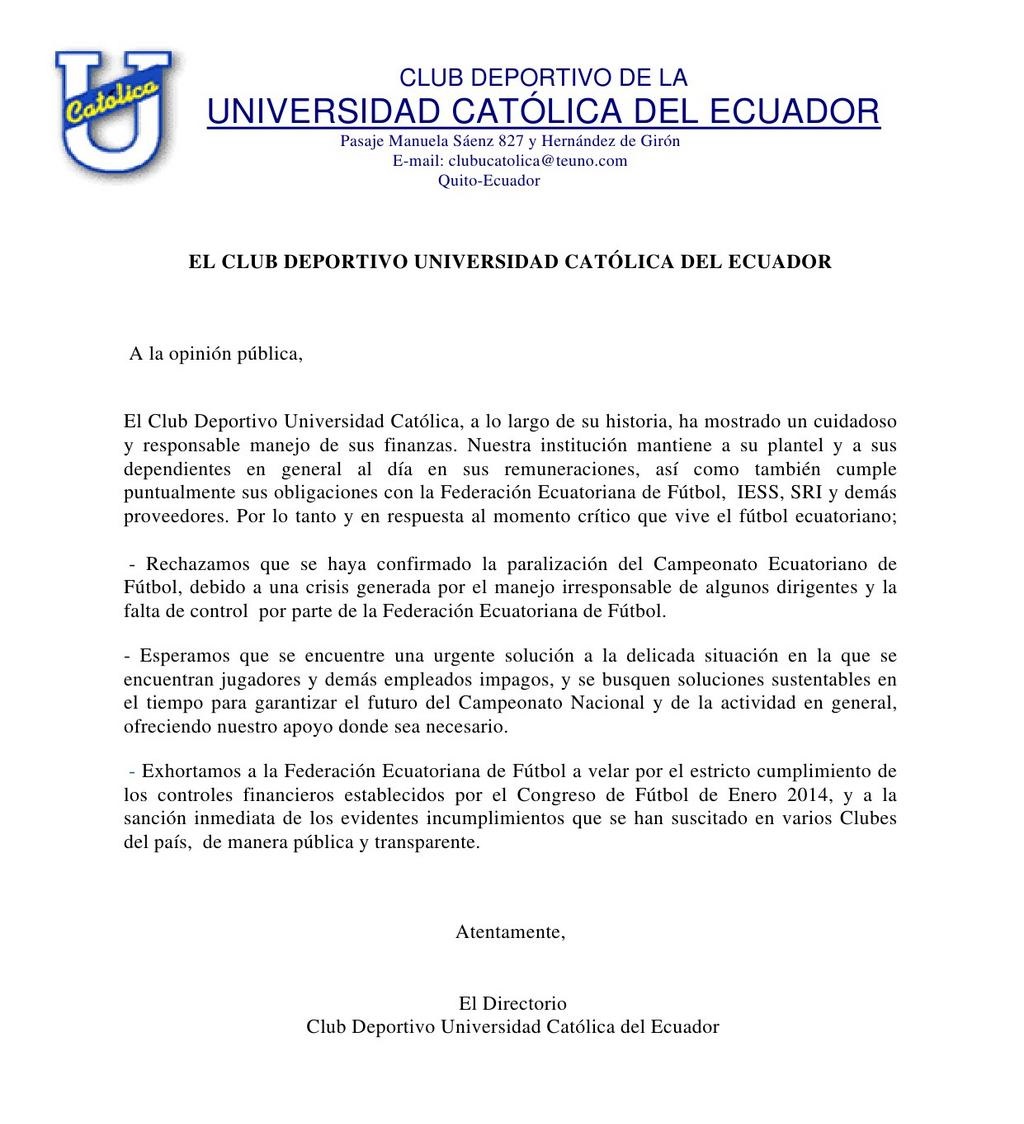 La carta está firmada por el Directorio del club y también se detalla que la Universidad Católica está al día en sus remuneraciones con el planter y dependientes en general, así como también con las obligaciones con la Federación Ecuatoriana de Fútbol, IESS, SRI y demás proveedores.