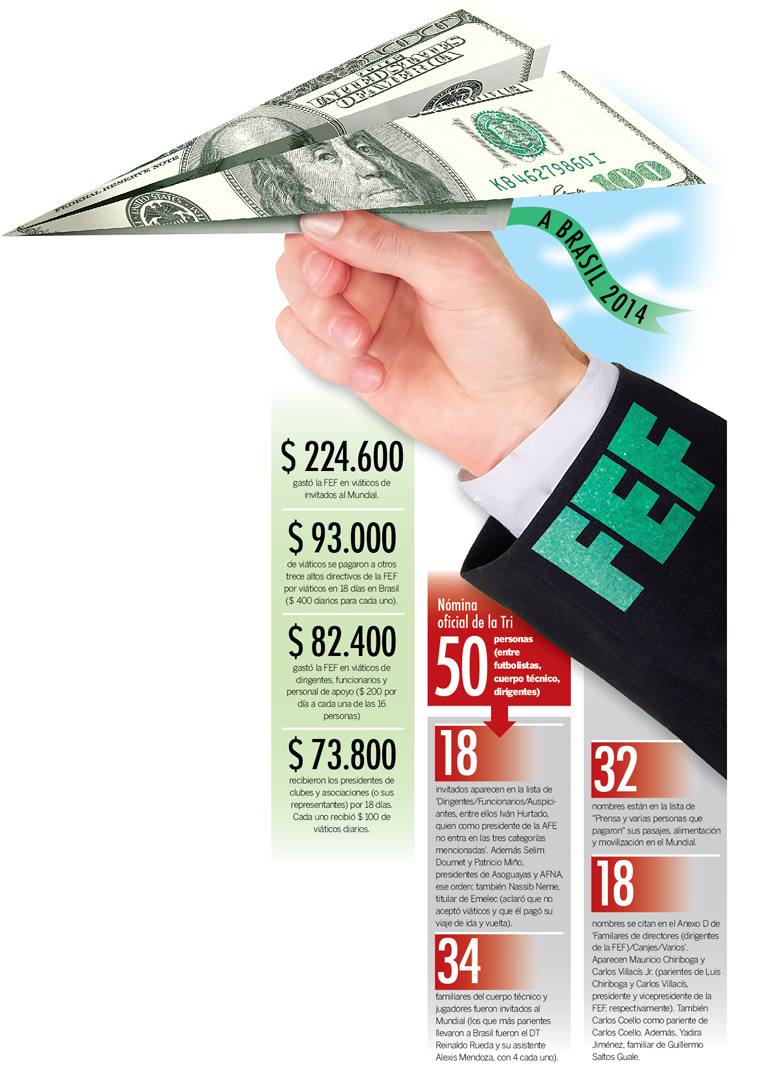 Cerca de $ 1,5 millones en viáticos y transporte de invitados al Mundial de Brasil 2014 habría gastado la Federación Ecuatoriana de Fútbol (FEF) “como justo reconocimiento” y por el “aporte desinteresado” de los dirigentes de los clubes y de asociaciones provinciales “durante todo el proceso eliminatorio”, según justifica el organismo en un informe entregado a Liga de Quito.