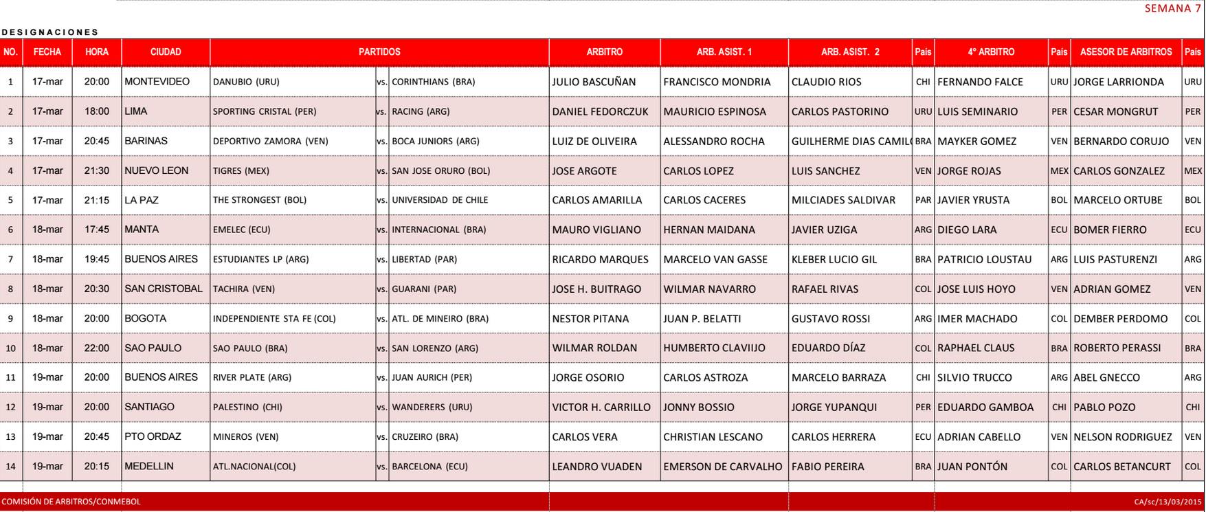 Finalmente, solo un partido de catorce a disputarse contará con un arbitraje ecuatoriano. El duelo entre Mineros de Guyana y Cruzeiro, correspondiente a la cuarta fecha del Grupo 3 tendrá la dirección de Carlos Vera como primer juez, junto con Christian Lescano y Carlos Herrera como asistentes; el cuarto réferi será Adrián Bello.