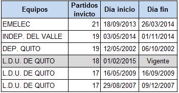 - A continuación las mejores rachas invicto en el fútbol de Ecuador en el siglo XXI:
