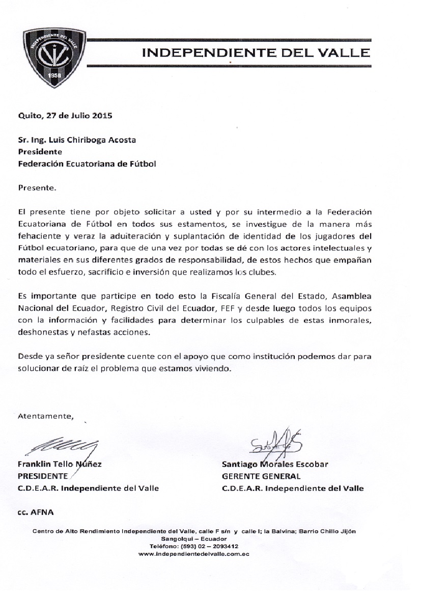 Por medio de sus medios oficiales, la directiva de Independiente del Valle compartió el documento que enviaron a la Federación Ecuatoriana de Fútbol (FEF), con respecto a la problemática de los jugadores con documentos adulterados en Ecuador.