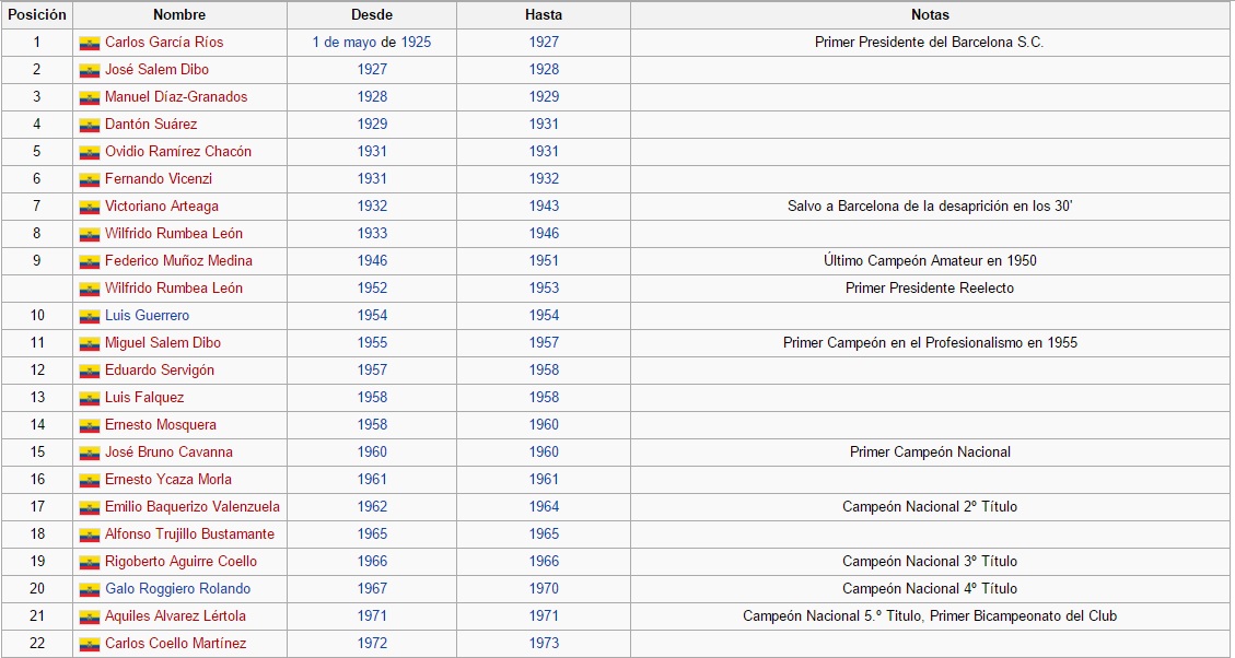 El portal ecuagol.com hace un repaso de los presidentes que ha tenido Barcelona SC a lo largo de su historia, desde el primer dirigente que asumió, luego de que ayer se haya elegido a José Francisco Cevallos como nuevo mandatario de la institución.