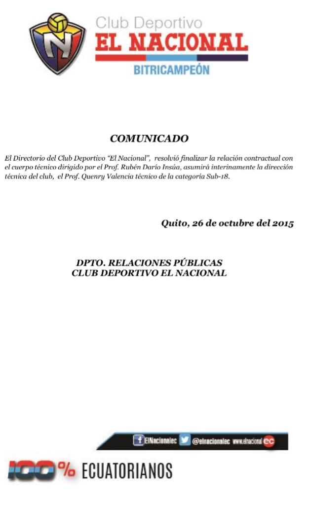 Pocos minutos después, la misma directiva de El Nacional, con un boletín de prensa, ya oficializó la salida de Insúa y la llegada de Quenry Valencia con interino: