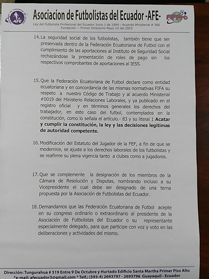 En tales circunstancias el Directorio de la Asociación de Futbolistas del Ecuador, reunido en forma urgente el día de hoy miércoles 25 de noviembre del 2015 ha resuelto entregar a usted señor Presidente y a los miembros del Comité Ejecutivo de su Presidencia los siguientes planteamientos y solicitudes que agradeceremos se digne responder por lo menos en las 24 horas siguientes para el bienestar de los futbolistas del país. Si nuestra solicitud, al igual que muchas comunicaciones anteriores no tuvieran respuesta alguna, la Asociación de Futbolistas del Ecuador utilizará todos los mecanismos constitucionales en la defensa de los derechos que se le están conculcando, lo cual motivara de que en forma inmediata, concluido el referido periodo los futbolistas profesionales les comuniquemos tanto a ustedes como al país, al igual que a la FIFPRO y a la FIFA, las medidas que vamos a adoptar.