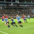 Diego Godín, Álvaro Pereira y Martín Cáceres anotaron los goles uruguayos. Godín abrió el marcador a los 24 minutos tras recibir en el área un preciso envío del zaguero Sebastián Coates. Esa fue una curiosa constante en el partido: todos los goles de la Celeste fueron producto de acciones de sus volantes o defensas, nunca de los delanteros.