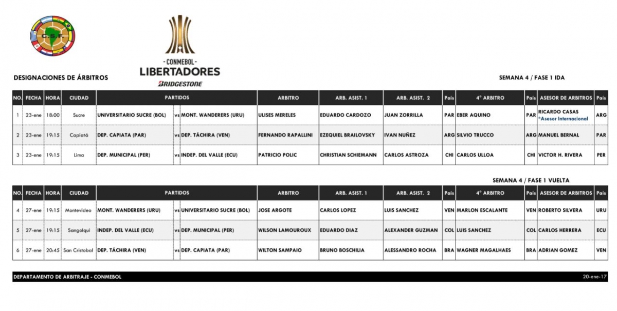 El Departamento de Arbitraje, de la Confederación Sudamericana de Fútbol, designó ayer a los jueces que dirigirán los partidos de la Primera Fase de la Conmebol Libertadores 2017.