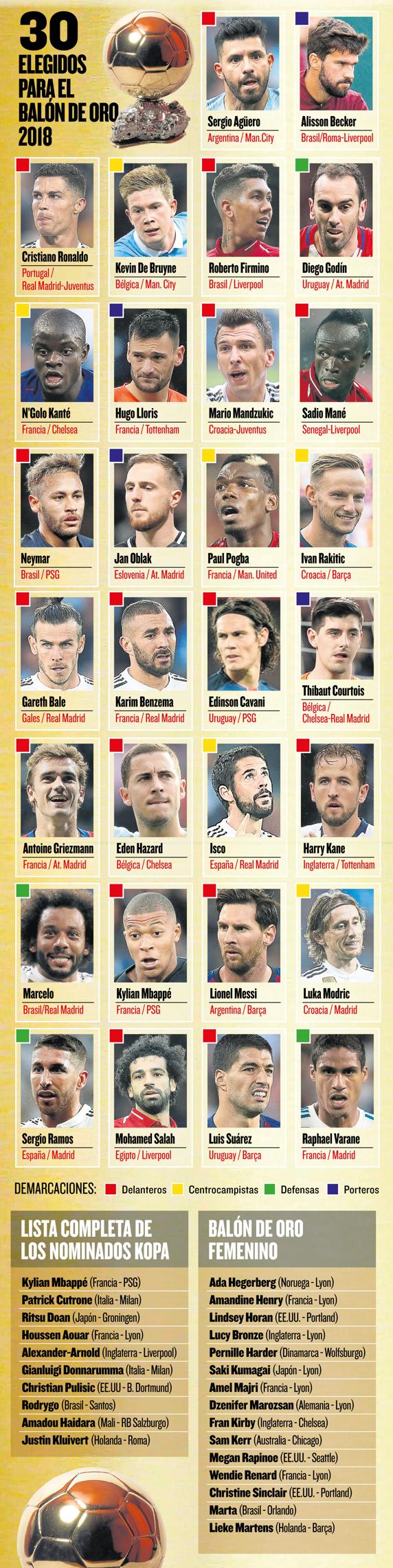 El argentino Lionel Messi (FC Barcelona), el brasileño Neymar (PSG), el croata Luka Modric (Real Madrid) y el portugués Cristiano Ronaldo (Juventus) son algunos de los nombres que figuran entre los 30 jugadores nominados que aspiran al Balón de Oro, señaló este lunes en las redes sociales France Football, organizadora del trofeo.