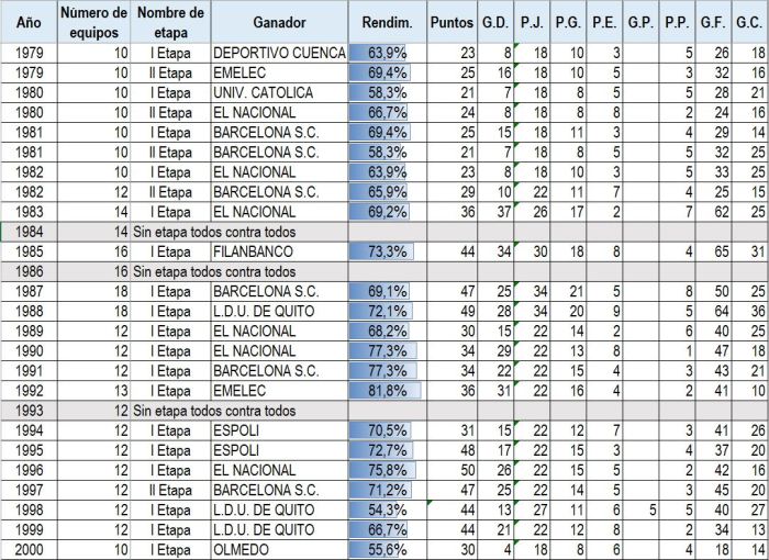 Por equipo y desde el primer torneo en 1957, estos son los equipos ganadores de etapas (en algunos casos, esto también correspondió al título de la temporada: 1957, 1960, 1961, 1962 -se jugó un desempate por igualdad de puntos entre Everest y Barcelona-, 1964 -se jugó un desempate entre El Nacional, Deportivo Quito y Liga de Quito-, 1965, 1967 y 1969).