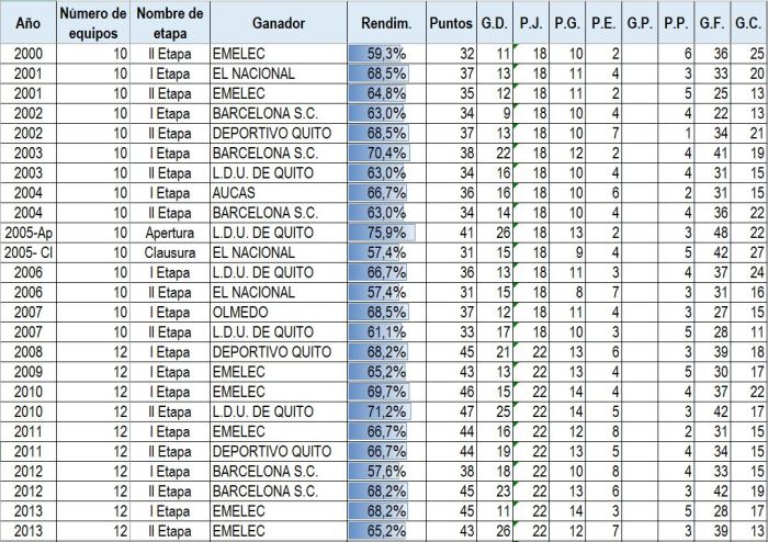 Luego de ese logro, Emelec venció en otras 16 etapas, con diferentes números de equipos. Ocho de esas etapas han sido ganadas entre 2010 y 2018, la mejor época en la historia del equipo eléctrico.