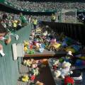 Muchos de los 49.000 espectadores que acudieron al estadio Benito Villmarín arrojaron los peluches a la cancha durante el entretiempo del partido ante el Eibar, como parte de una iniciativa del club sevillano para reunir juguetes que se donarán a niños necesitados en estas festividades navideñas.