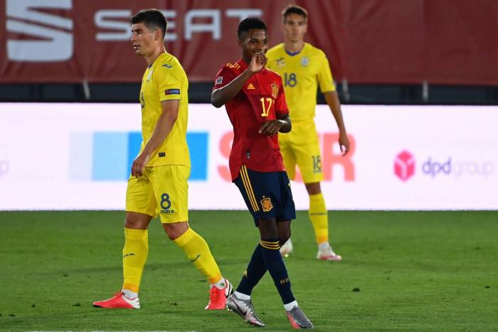 Fati se había mostrado hasta ese momento muy incisivo, prodigando remates y regates, con varias ocasiones, incluido un remate de chilena, que dio en el cuerpo de un defensa ucraniano y se fue a córner, en el minuto 26.