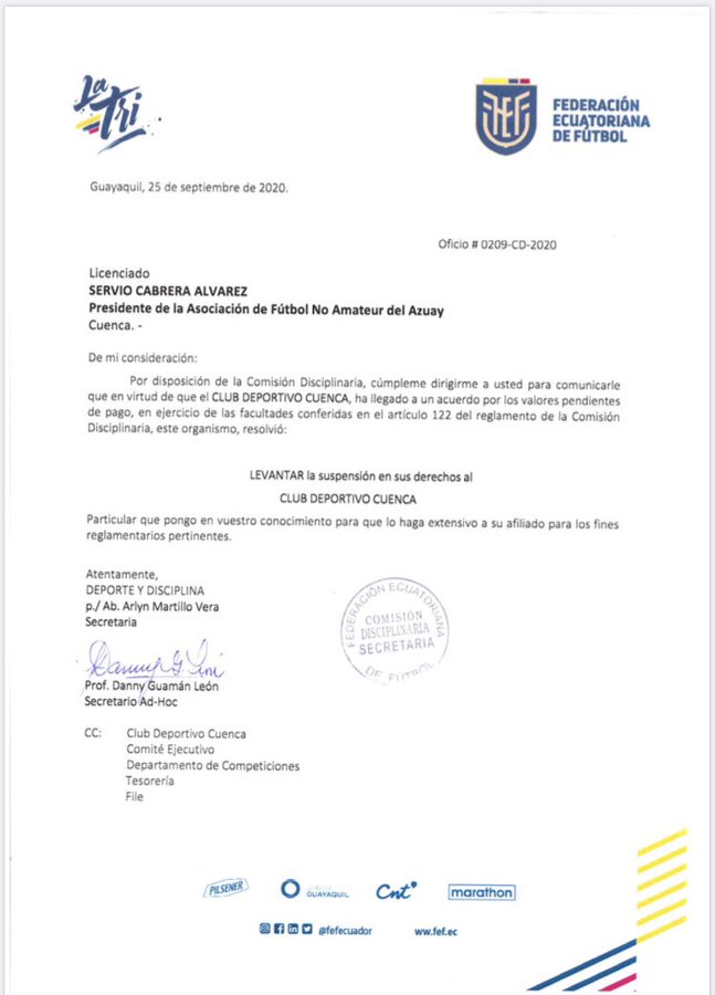 Buenas noticias para la hinchada colorada. Esta tarde de este viernes, sobre la hora, con su flamante directiva en funciones, el Deportivo Cuenca logró levantar la suspensión que le impedía disputar la 14ta fecha de la Serie A.
