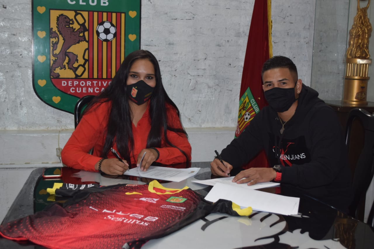 La periodista Vivi Sánchez Bonilla ha compartido una imagen donde se ve a la presidenta de Deportivo Cuenca, Nataly Villavicencio, junto a Washington Vera. Juntos están en la firma de contrato para que el mediocampista se vincule al club.