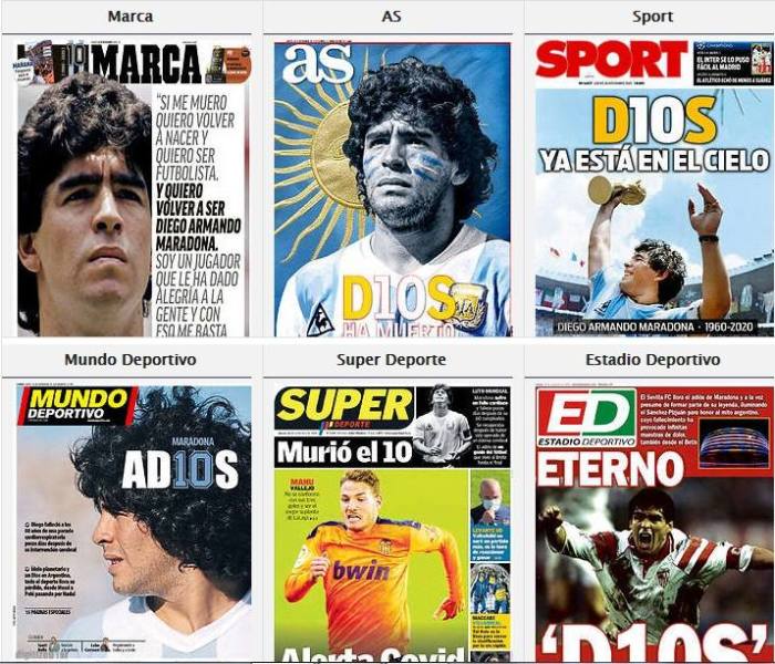 En primera, una gran foto de Maradona está acompañada por una cita que define «su mito, su carácter, su inmortalidad», según Marca: «Si me muero quiero volver a nacer y quiero ser futbolista. Y quiero volver a ser Diego Armando Maradona. Soy un jugador que le ha dado alegría a la gente, con eso me basta y me sobra».