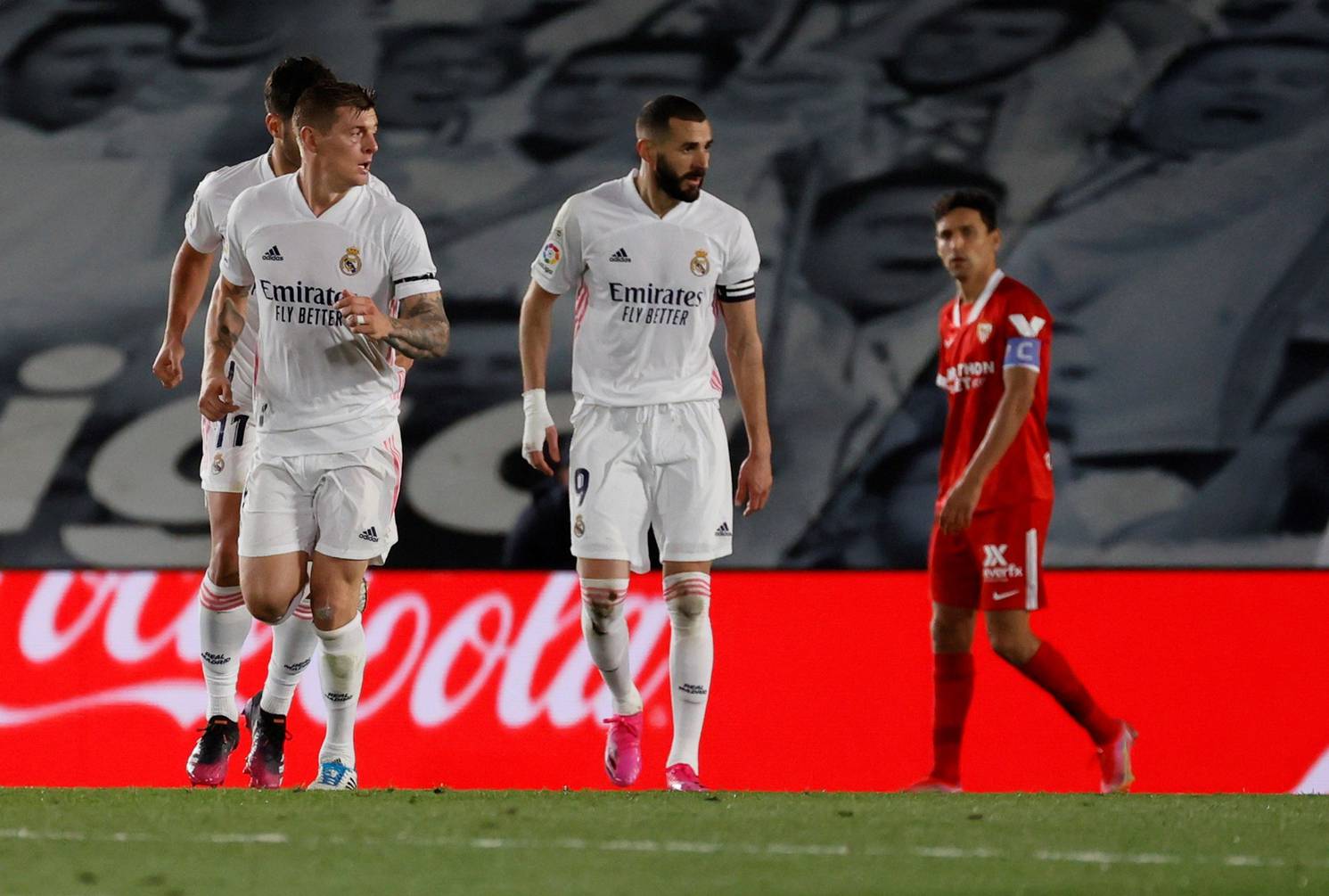 El Real Madrid logró rescatar un punto en el minuto 94 del partido contra el Sevilla (2-2) gracias a un disparo del alemán Toni Kroos desde la frontal que tocó en el belga Eden Hazard y se coló en la portería defendida por el marroquí Bono en un resultado que le deja a dos puntos del líder de LaLiga, el Atlético de Madrid.