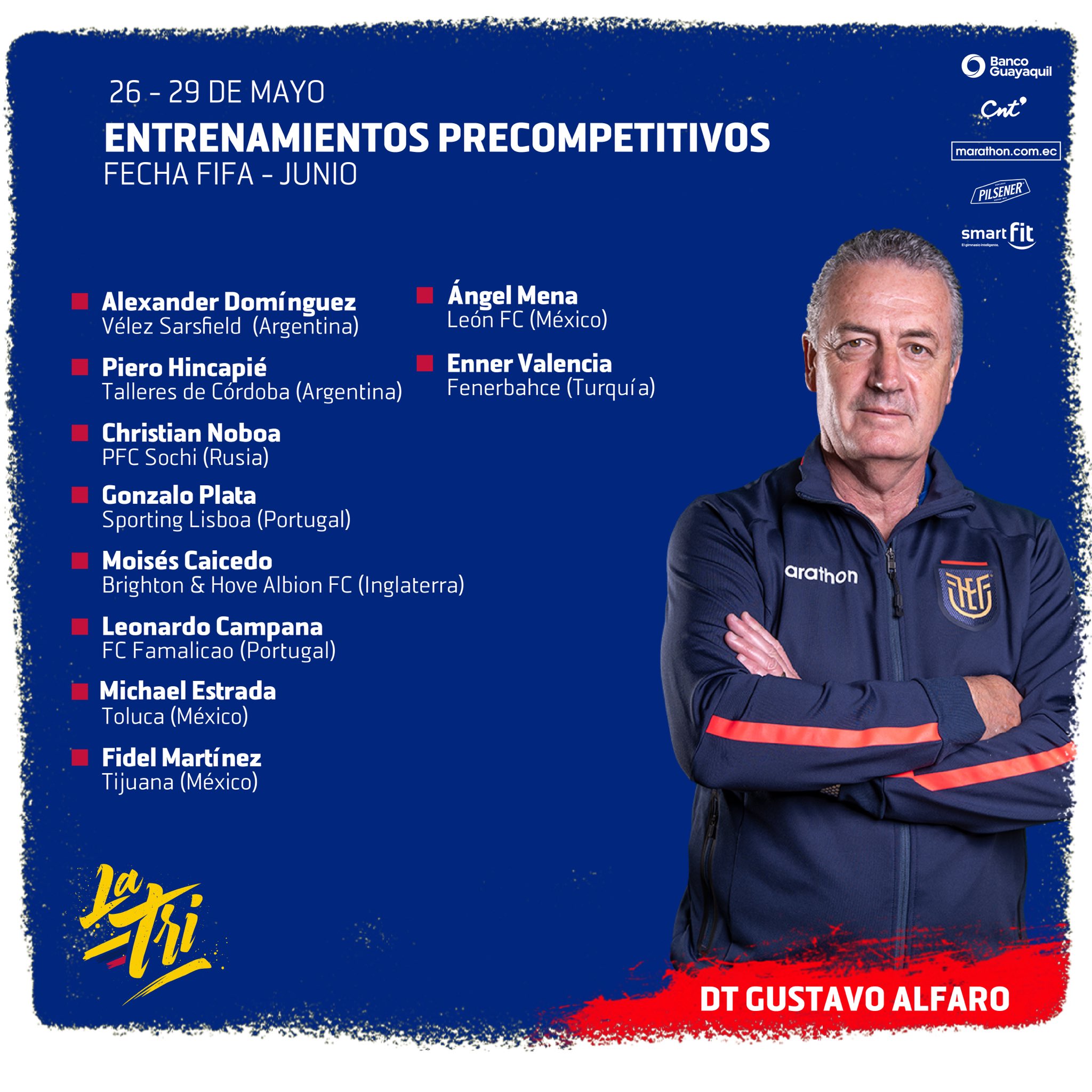 Sin que de momento exista una convocatoria oficial, ni fecha para la misma, el máximo organismo rector de nuestro fútbol ha convocado a: Alexander Domínguez (Vélez Sarsfield – Argentina), Piero Hincapié (Talleres – Argentina), Cristhian Noboa (Sochi FC – Rusia), Gonzalo Plata (Sporting CP – Portugal), Moisés Caicedo (Brighton & Hove Albion – Inglaterra), Leonardo Campana (Wolverhampton – Inglaterra), Michael Estrada (Toluca – México), Fidel Martínez (Xolos – México), Ángel Mena (León – México) y Énner Valencia (Fenerbahce (Turquía).