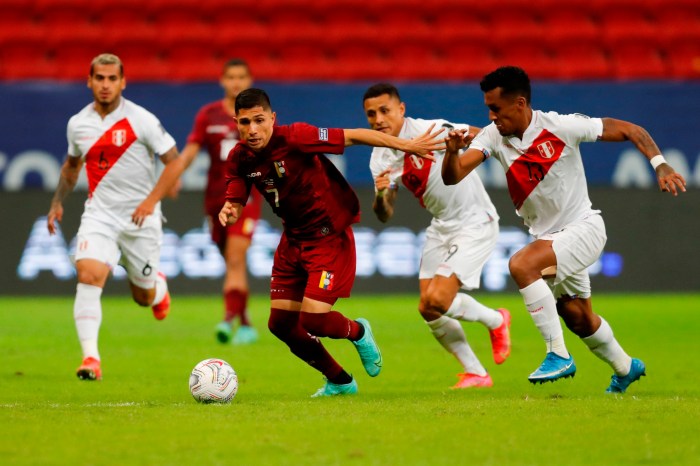 Perú controlaba las acciones. Pasados los 20 minutos del segundo tiempo Venezuela empezó a atacar buscando el empate, pero sin llegadas claras.