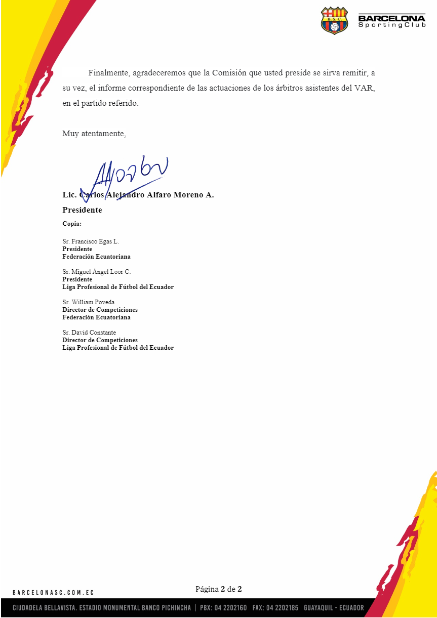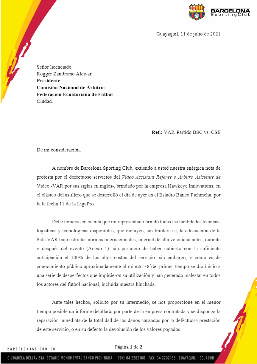 Barcelona Sporting Club no se quedó atrás y este medio pudo conocer que se envió una carta a la Comisión Nacional de Arbitraje.