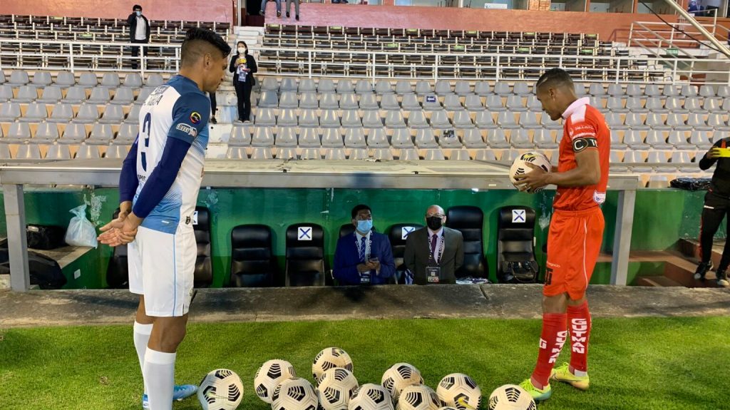 La voz del estadio pidió la presencia en la mesa de control de Eddie Guevara (capitán de Técnico Universitario) y Argenis Moreira (capitán de Manta) para tomar una resolución en compañía del Comisario.