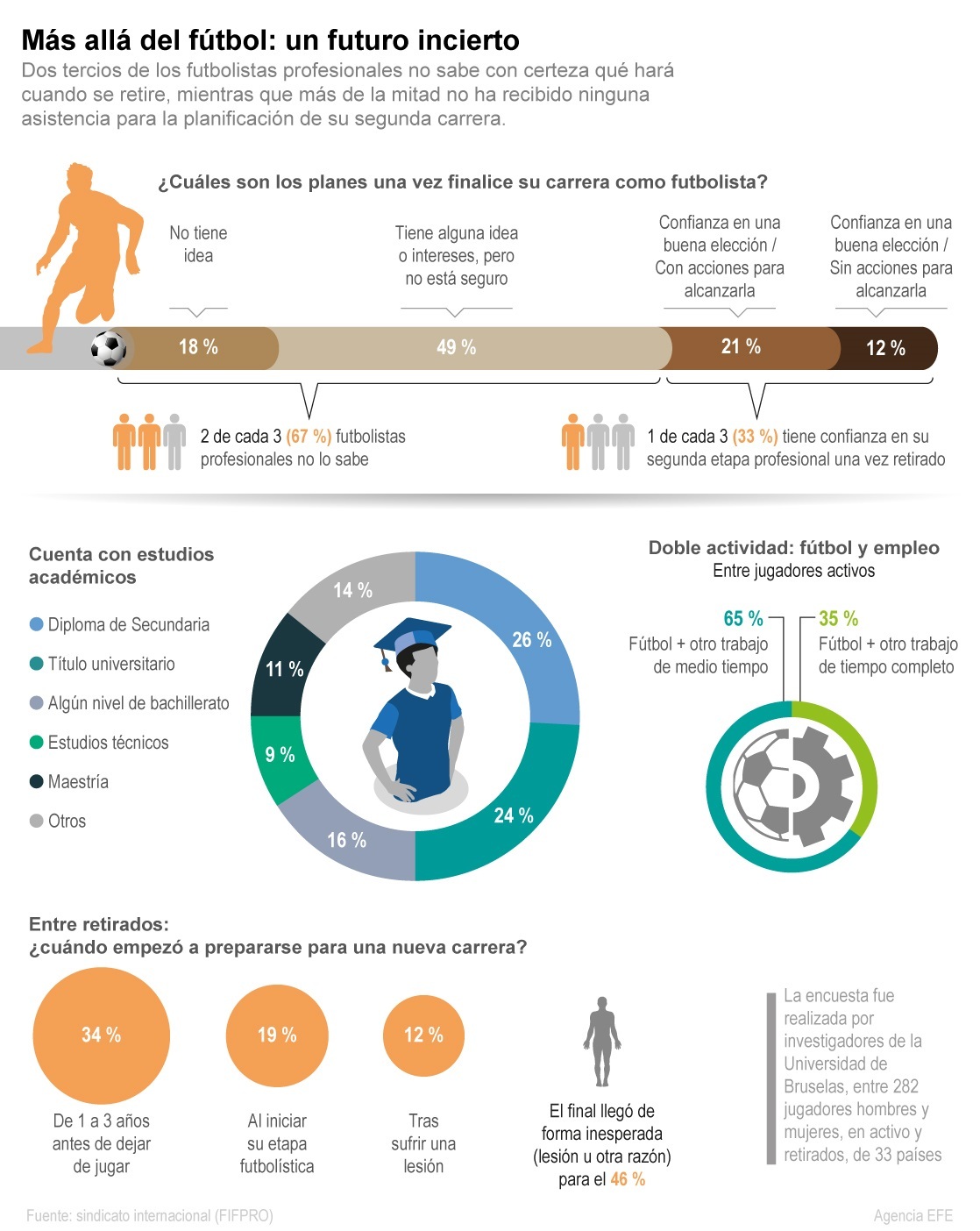 La mayoría de futbolistas profesionales no sabe con certeza qué hará cuando se retire, según una encuesta del sindicato internacional (FIFPro) entre jugadores en activo y retirados, que muestra que un 54% no recibió ninguna asistencia para la planificación de su segunda carrera.