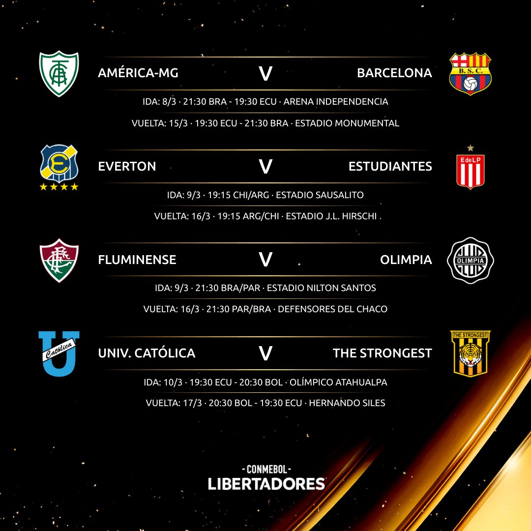 Mientras que Barcelona Sporting Club enfrentará al América Mineiro los martes 8 y 15 de marzo, el primer desafio en el Arena Independencia de Belo Horizonte y la vuelta en el Monumental de Guayaquil.