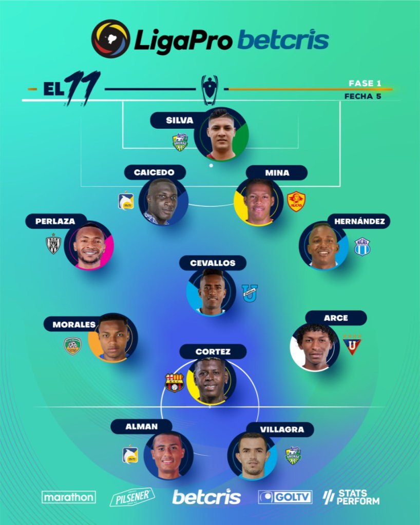 Este martes, después de completarse la quinta fecha en la primera fecha de la Liga Pro Betcris, la Liga Profesional del Ecuador dio a conocer el equipo ideal de la jornada; con sus jugadores más destacados.