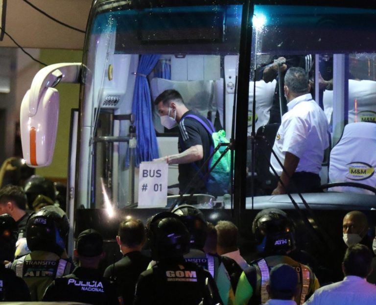 Al coro de «Messi, Messi, Messi» recibieron al bus de la delegación.