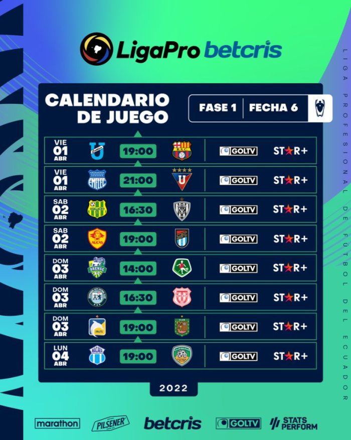 Sexta fecha en la LigaPro Betcris 2022, la jornada consume los mejores partidos en el primer día de acciones, ya que el viernes se enfrentaran Universidad Católica ante el líder Barcelona en el estadio Atahualpa y luego Emelec ante Liga de Quito en el Capwell.