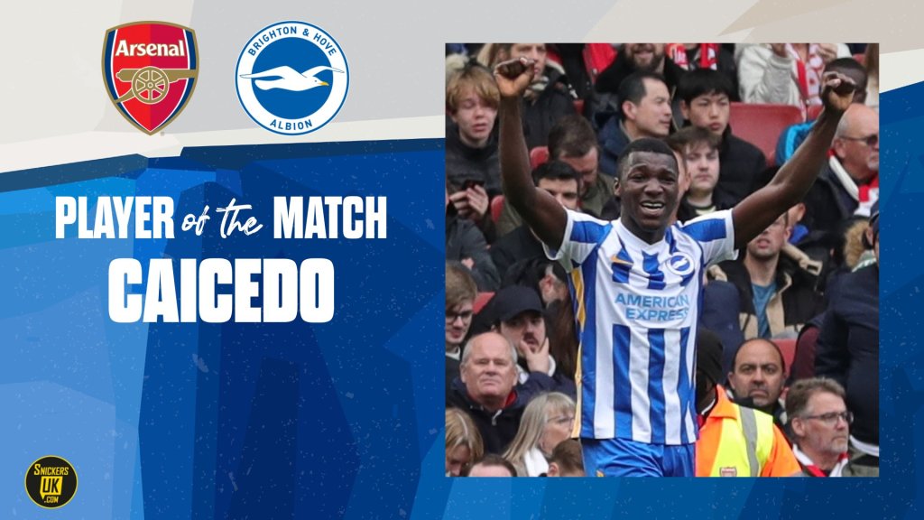 Brighton confirmó este domingo que Moisés Caicedo ha sido escogido como el mejor jugador que tuvo el partido que se midieron frente al Arsenal. Noventa minutos impecables más una asistencia le han significado, el reconocimiento de sus aficionados.