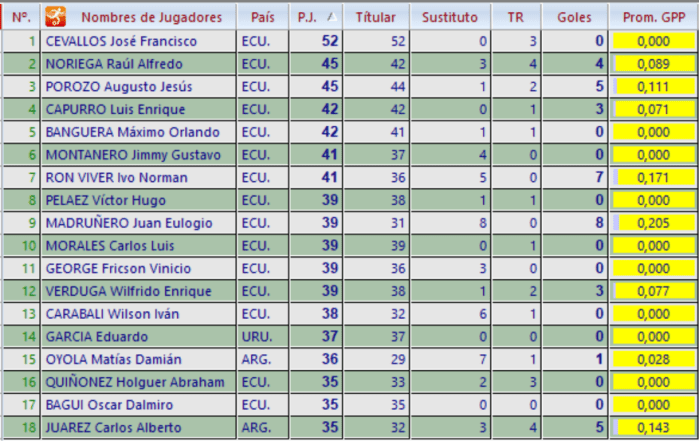 | Guayaquil Alberto Spencer | 97 | 34 | 30 | 33 | 117 | 119 |