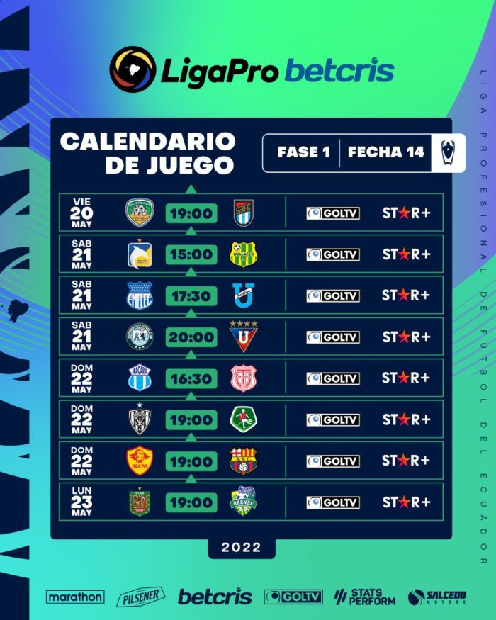 Décima cuarta fecha en la LigaPro Betcris 2022, momento definitorio de la Fase 1, donde Barcelona que reservó jugadores en la Copa Sudamericana, debe visitar al Aucas el domingo con la opción de llevarse los tres puntos y esperar un traspié de Independiente del Valle que a la misma hora recibe al Mushuc Runa.