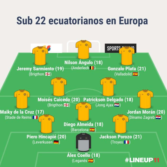 Los periodistas de Récords Sports EC realizaron un gráfico en su cuenta de Twitter en donde dieron a conocer un once con ecuatorianos sub 22 en el fútbol europeo, con varios nombres de la Tri actual pero con otros con mucha proyección.