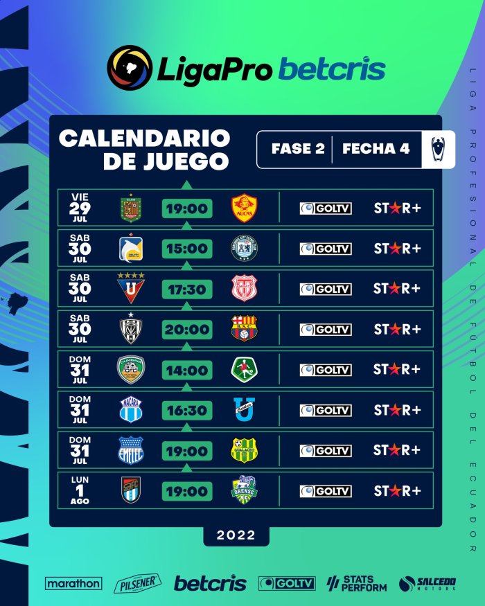 Cuarta fecha en la Fase II de la Liga Pro, primera jornada para que Aucas defienda el liderato y abre la jornada visitando al Deportivo Cuenca, luego de solo tres días de descanso, tras su victoria histórica ante Emelec por Copa Ecuador. Y abriendo la jornada del sábado juega el nuevo escolta Delfín ante Guayaquil City.