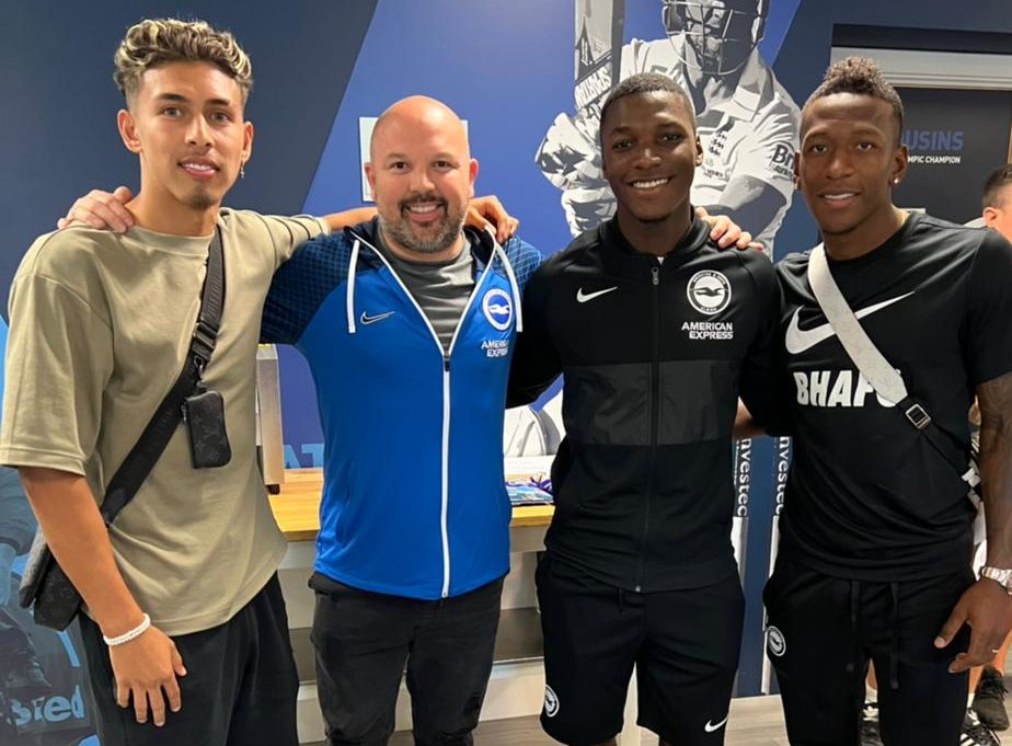 El máximo dirigente de la Liga Profesional no perdió la oportunidad de verse con los tres ecuatorianos que militan en las ‘Gaviotas’; Jeremy Sarmiento, Moisés Caicedo y Pervis Estupiñán.