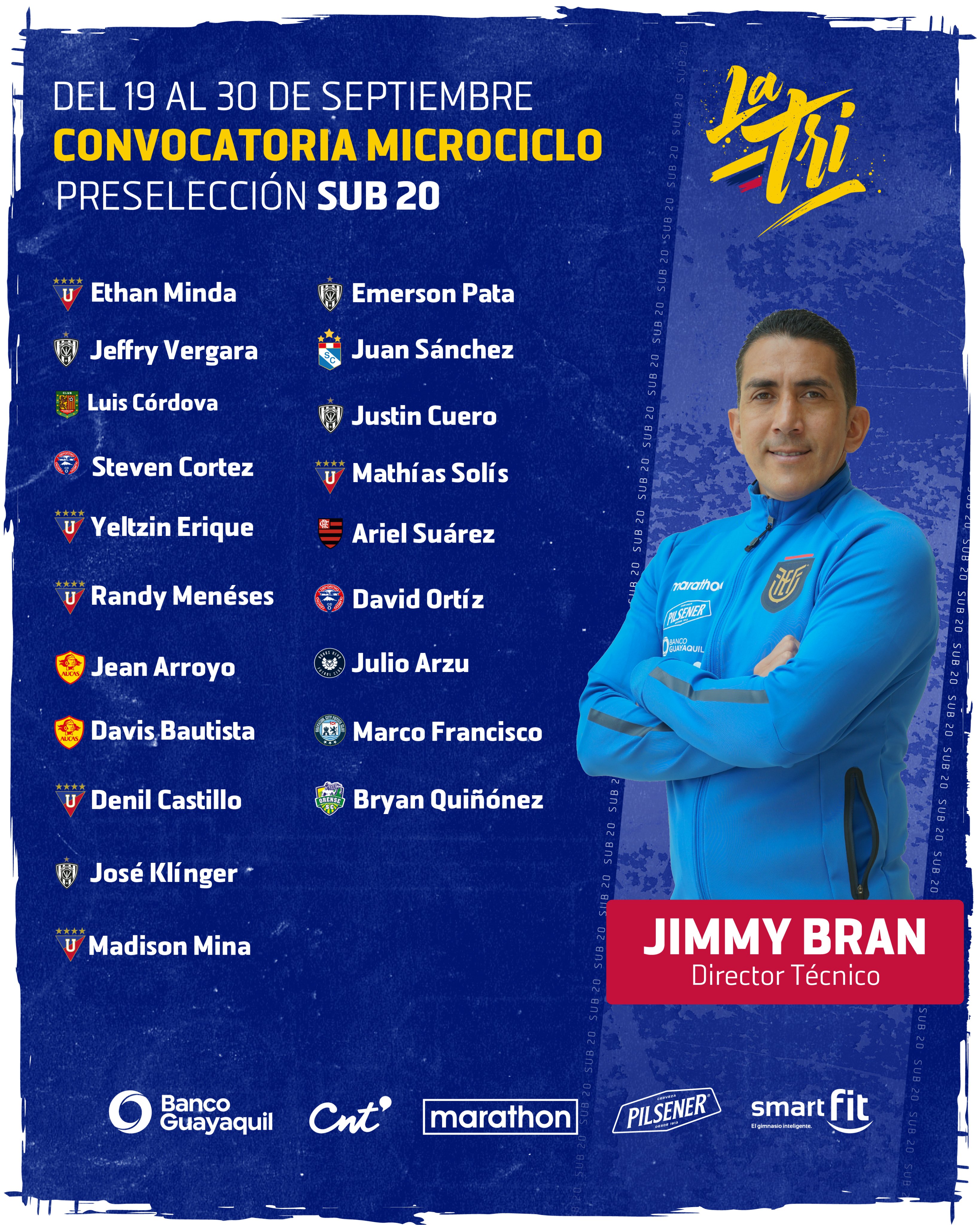 Bajo el comando de Jimmy Bran, ex futbolista que pasó por clubes como el Club Sport Emelec, el Club Deportivo El Nacional, Deportivo Cuenca e Independiente del Valle, la Selección Ecuatoriana Sub 20 cumplirá con un microciclo desde hoy hasta el 30 de septiembre.