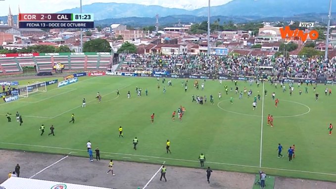 El cuadro local superaba por dos a cero al conjunto caleño cuando los hinchas de este ingresaron al campo de juego para querer agredir a los jugadores y cuerpo técnico. El partido se suspendió.