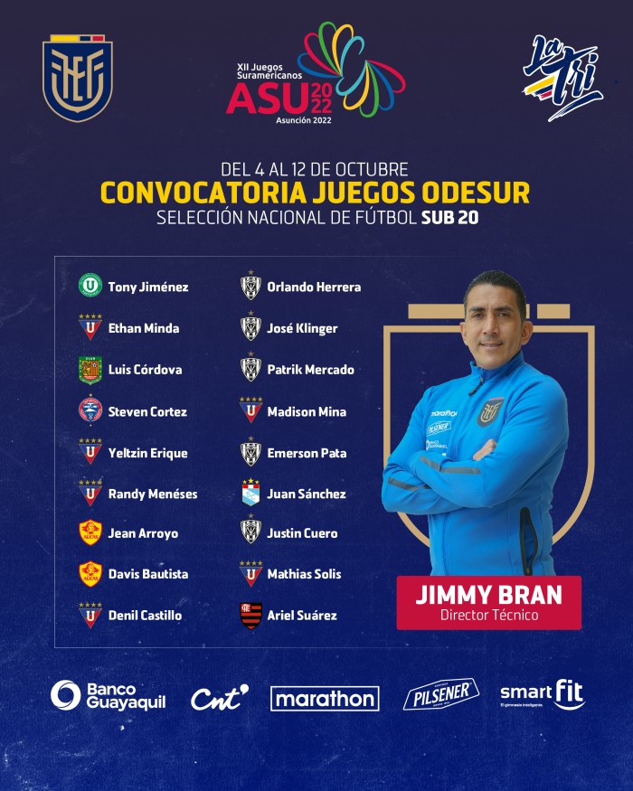 Ya vino probando a jugadores en microciclo en los últimos meses y finalmente, este lunes, la Federación Ecuatoriana de Fútbol (FEF) presentó la lista de 18 jugadores que convocó el Profe Jimmy Bran para representar a la Mitad del Mundo en los Juegos Odesur ‘Asunción 2022’.