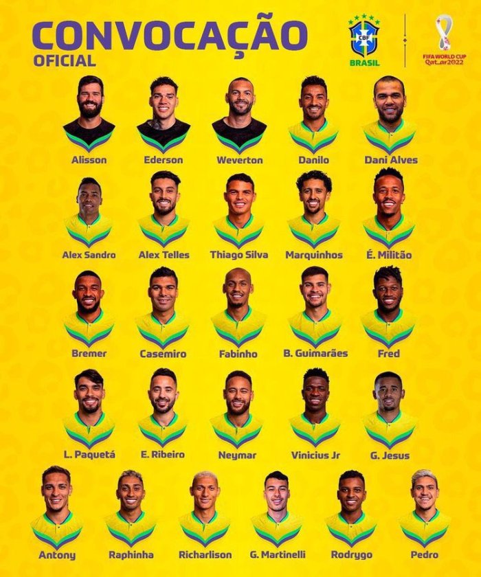 - Atacantes: Antony, Gabriel Jesús, Gabriel Martinelli, Neymar, Pedro, Raphinha, Richarlison, Rodrygo, Vinicius Júnior.