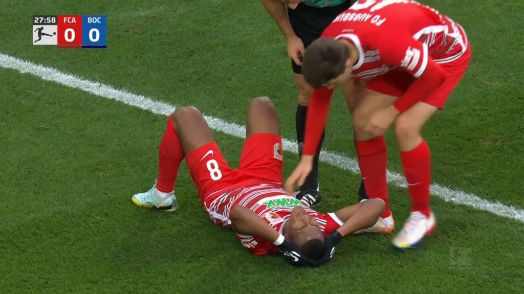 “El FC Augsburg tiene que hacer un segundo cambio por lesión en el partido contra el Bochum: Carlos Gruezo fue sustituido en el minuto 30 tras recibir atención médica sobre el césped. Arne Maier entró en juego por él. Previamente, el capitán Jeffrey Gouweleeuw tuvo que abandonar involuntariamente”.