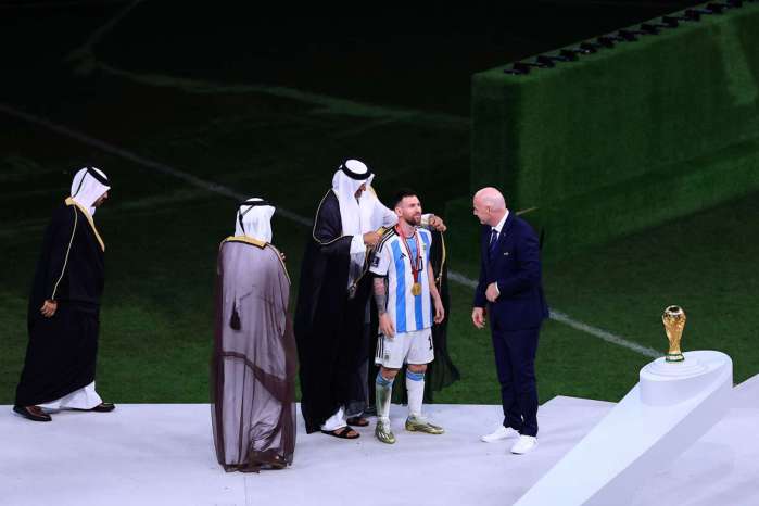 La misma fue colocada en el cuerpo de Messi antes de recibir la Copa del Mundo, y vio como Tamim bin Hamad Al Thani, el actual emir de Qatar, retrasó un poco la entrega del trofeo para así colocarle dicha prenda al ahora considerado como el mejor jugador del Mundo.