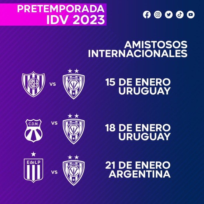 Preparándose para el 2023 en el que peleará en Serie A, Copa Ecuador y en Copa Libertadores (desde fase de grupos), IDV se medirá en Uruguay contra San Lorenzo (Campeón de la Libertadores 2014) y Deportivo Maldonado, antes de enfrentar a Estudiantes de la Plata (Campeón de la Libertadores 1968, 1969, 1970 y 2009) el 21 de enero en Argentina.