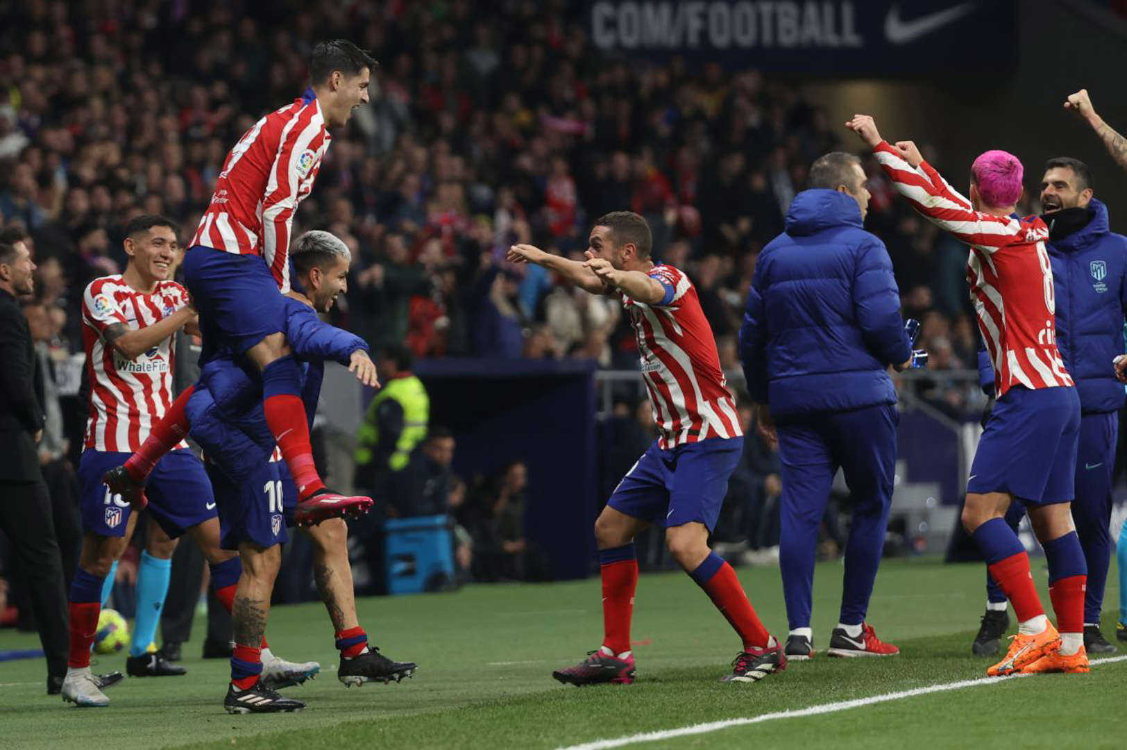 Esto desencadenó un hecho aún más inédito, todos los jugadores colchoneros tuvieron que correr hacia el banco de suplentes y ahí celebraron junto al argentino mientras Diego Simeone trataba de obligar a una de sus figuras a quedarse en el campo para que Getafe no sacara rápido.
