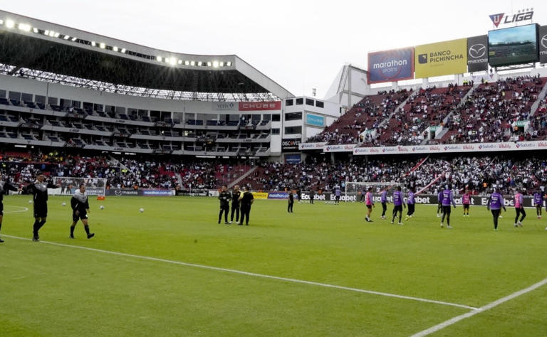 Estos hinchas se subieron a las mallas de la general sur y empezaron a gritarle a los jugadores para que busquen el empate ante Barcelona SC. René Marín detuvo el encuentro durante varios minutos, hasta que dichos hinchas bajen de las mallas y dejen de tirar objetos a la cancha.