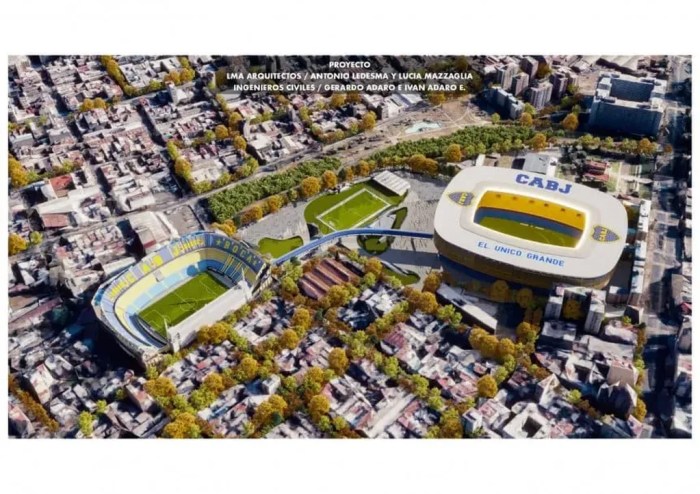 Boca encararía la construcción de un nuevo estadio para 105.000 espectadores, que se ubicaría muy cerca de la actual Bombonera, que puede albergar a 57.000 fanáticos. Las dos canchas estarían separadas apenas por dos cuadras y unidas por un puente. Ambas se habilitarían en cada partido que el equipo juegue como local. En el viejo estadio el encuentro se podría observar a través de pantallas gigantes. Es decir que sería una especie de ‘fan fest’. Al cabo, los xeneizes serían los primeros en el mundo en tener dos estadios llenos simultáneamente alentándolos.