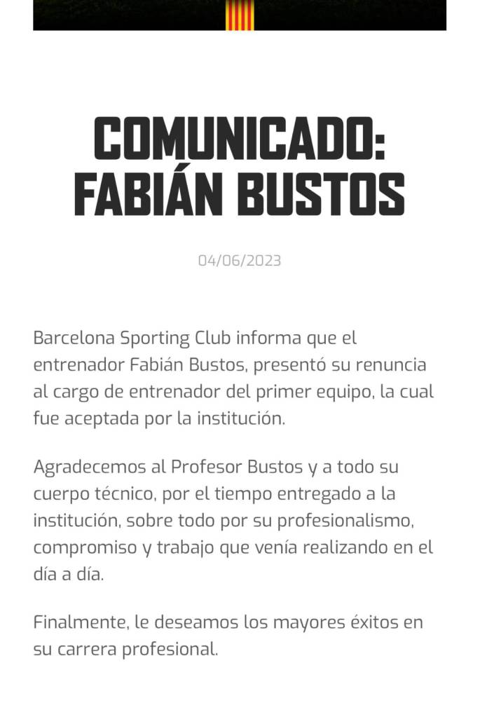 El Barcelona Sporting Club ha confirmado esta mañana y de manera oficial que el entrenador argentino Fabián Bustos no seguirá en el equipo amarillo. En un comunicado oficial dieron a conocer que el DT renunció a su cargo tras la derrota en el Clásico ante Emelec.