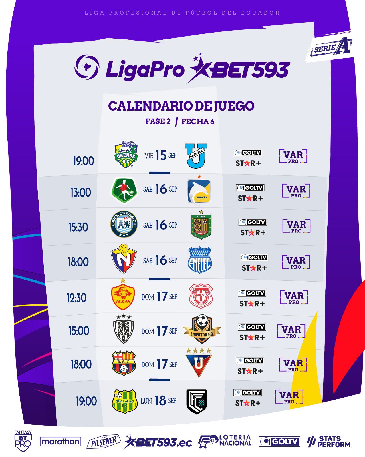 Sexta fecha en la fase II de la LigaPro Bet593, jornada marcada por el partido que cerrará la semana entre Barcelona y el líder Liga de Quito en el estadio Monumental. Los escoltas abrirán la jornada del sábado en Echaleche con el partido entre Delfín y Mushuc Runa.