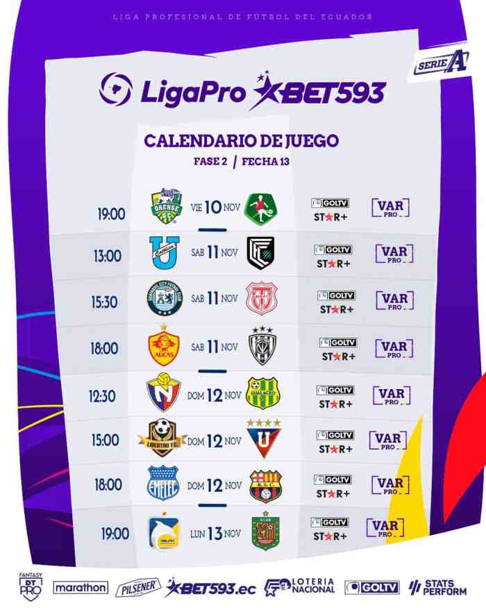 Décima tercera fecha en Fase Dos de LigaPro Bet593, Liga de Quito es el nuevo puntero tras cumplir sus dos diferidos y ahora enfrentará a Libertad FC en Loja, posterior a su posterior tendremos el último Clásico del Astillero del año en el estadio Capwell, estos partidos definirán al líder tras la jornada.