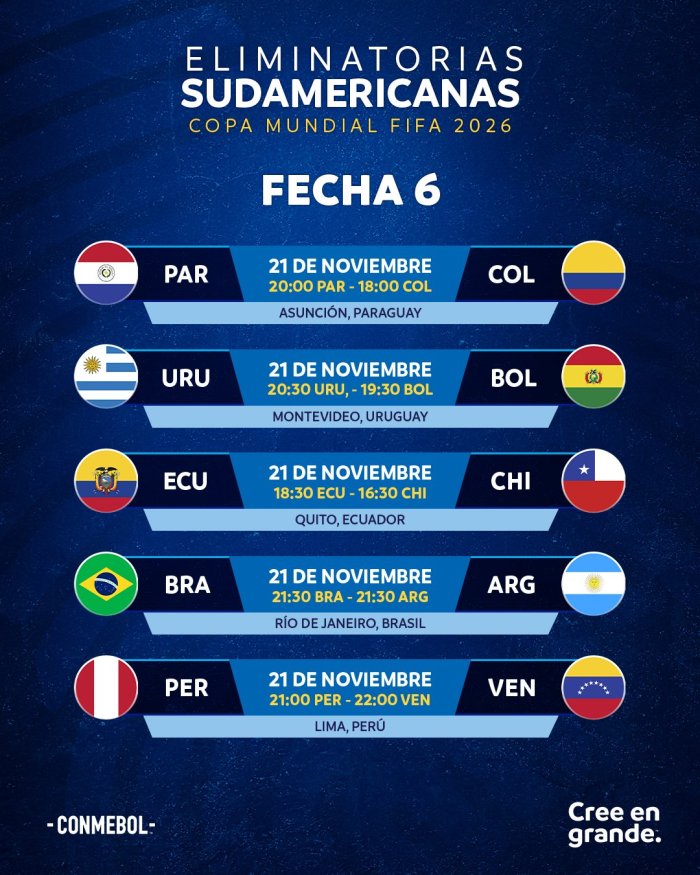 Tras la jornada previa, Colombia es el único invicto en esta Eliminatoria y en el caso de una derrota consecutiva del «Campeón Mundial» Argentina en el superclásico ante Brasil, hasta podríamos tener nuevo líder. Por su parte, Ecuador deberá volver a la senda de la victoria al enfrentar a Chile en el Rodrigo Paz.